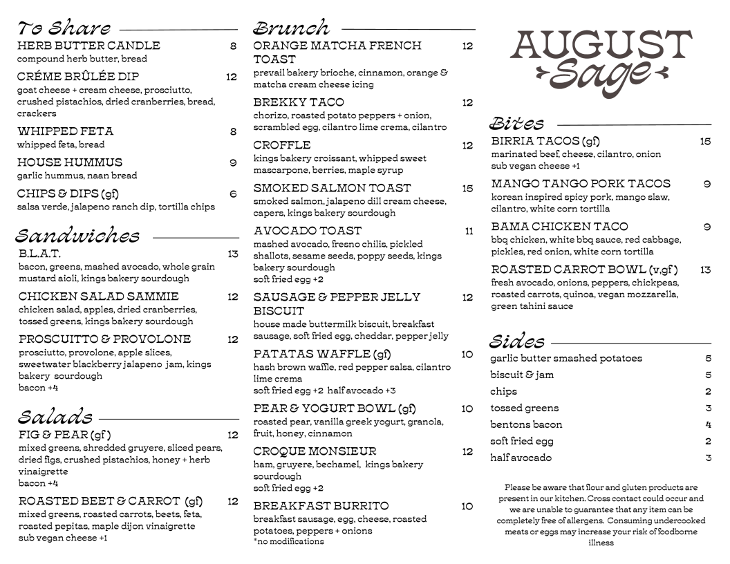 If you’re looking for a cozy spot with delicious food in Columbia, TN, the August Sage Cafe Menu offers a delightful selection that’s sure to satisfy your cravings. Located at 101 N James Campbell Blvd Suite 6, this café brings together comfort and flavor in every dish. Whether you’re in the mood for a fresh salad, a hearty sandwich, or a warm, home-style entrée, their menu has something for everyone. You’ll find everything prepared with care and the best ingredients, making each meal feel like a treat.